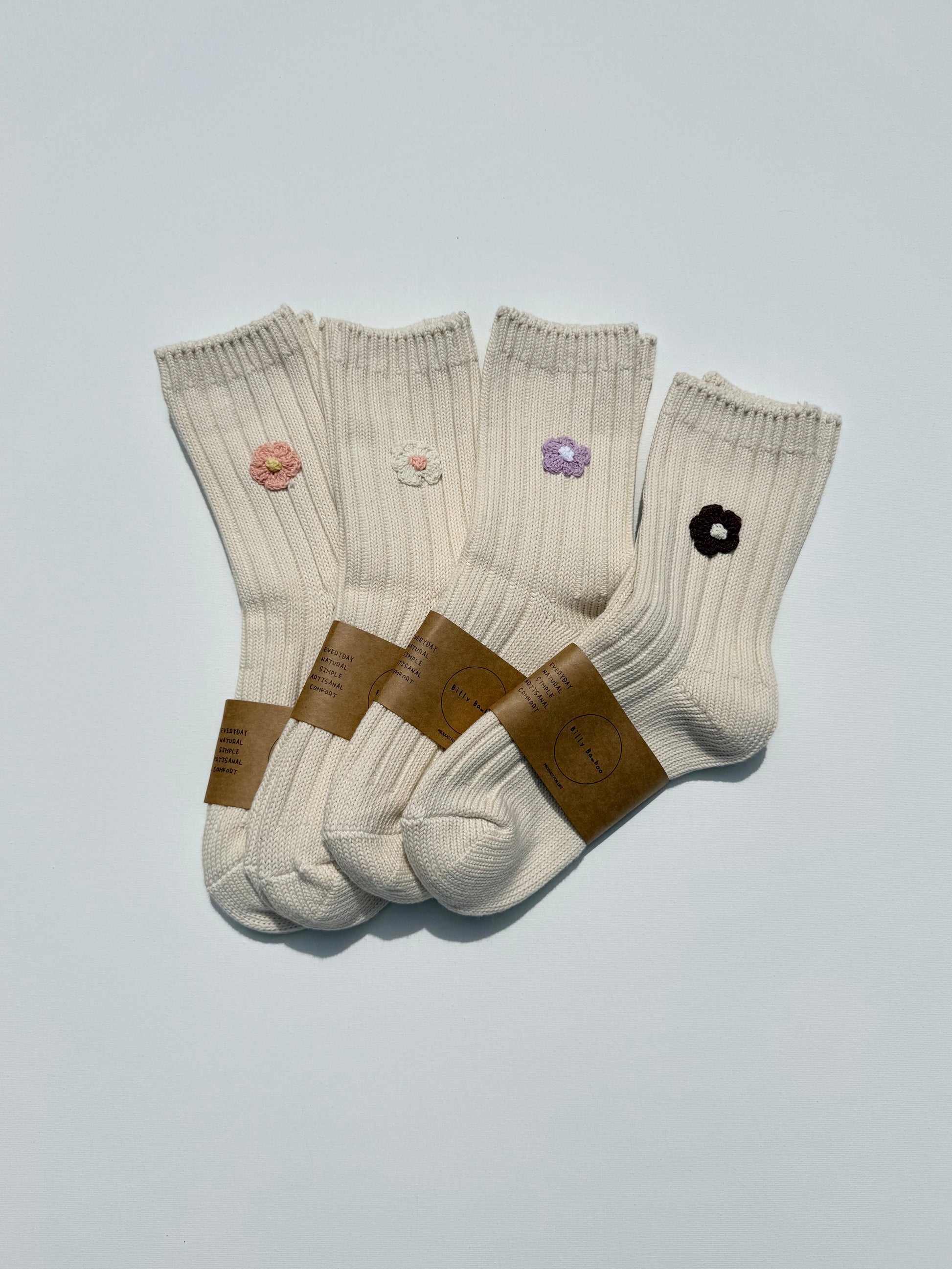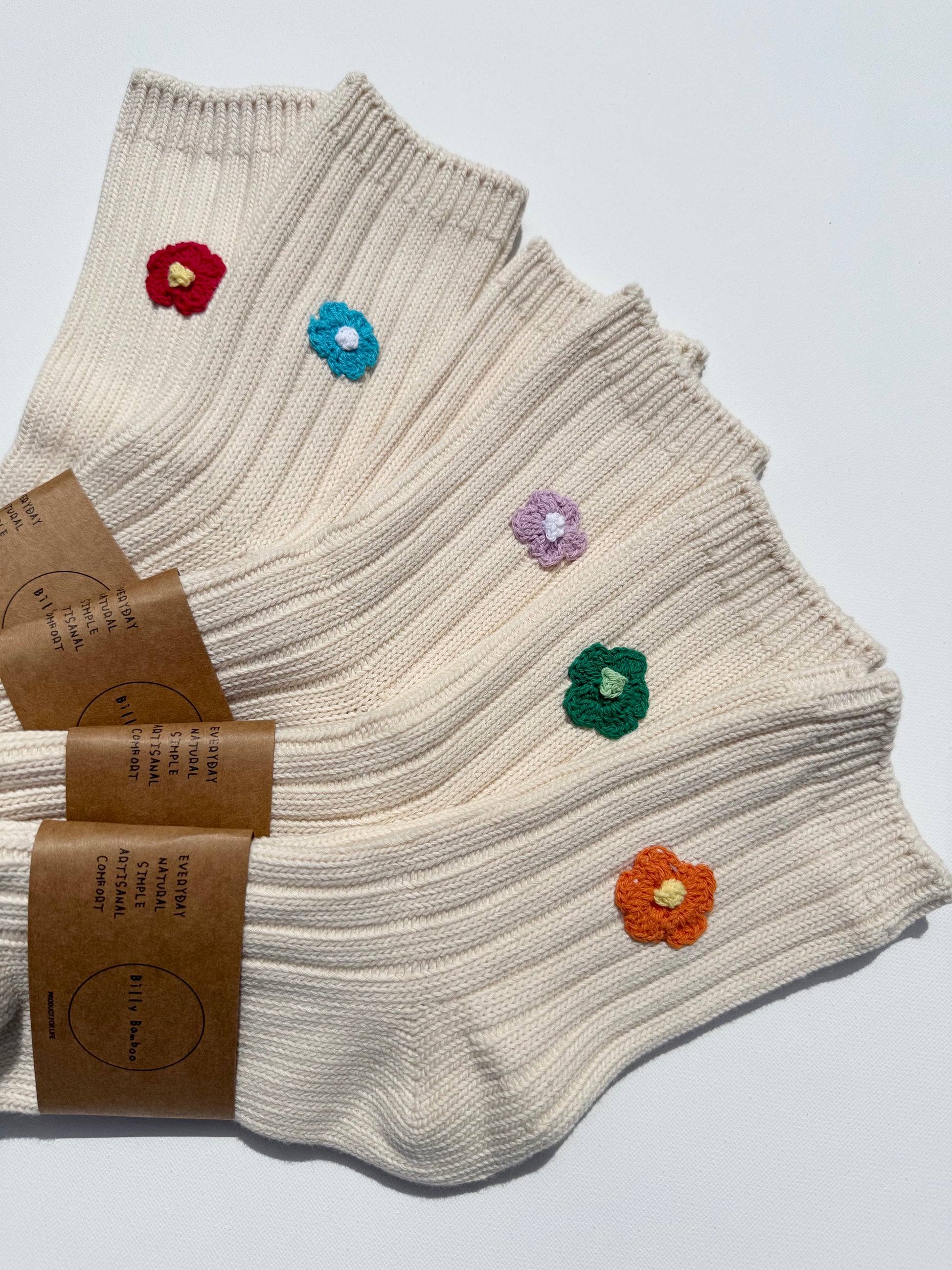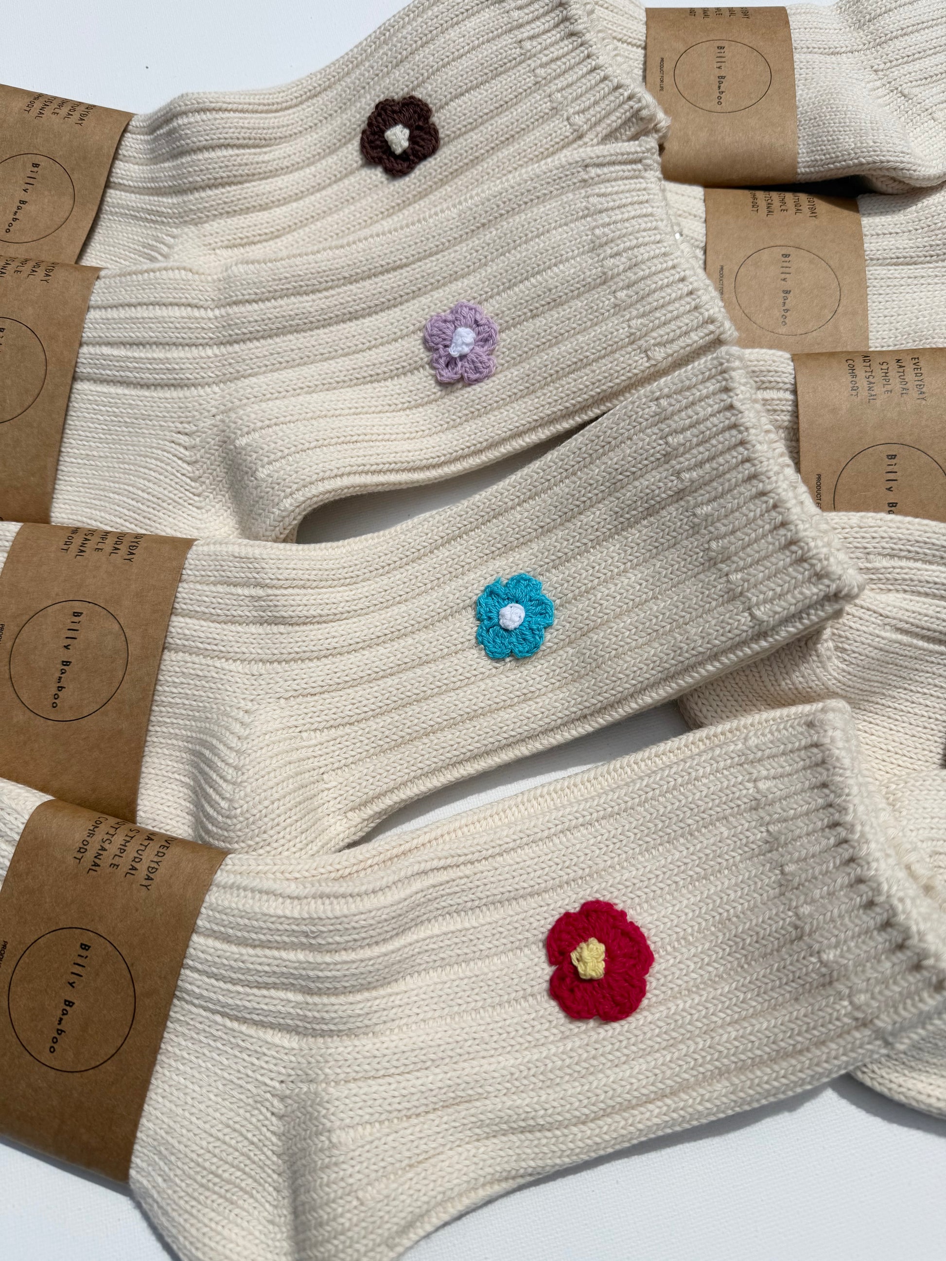 Built on our best-selling ribbed organic cotton blend, these limited-edition socks are finished with hand-appliquéd crochet flowers, each one carefully sewn in our Toronto studio. The result is a playful twist on a timeless silhouette: soft, stretchy, and made to last.