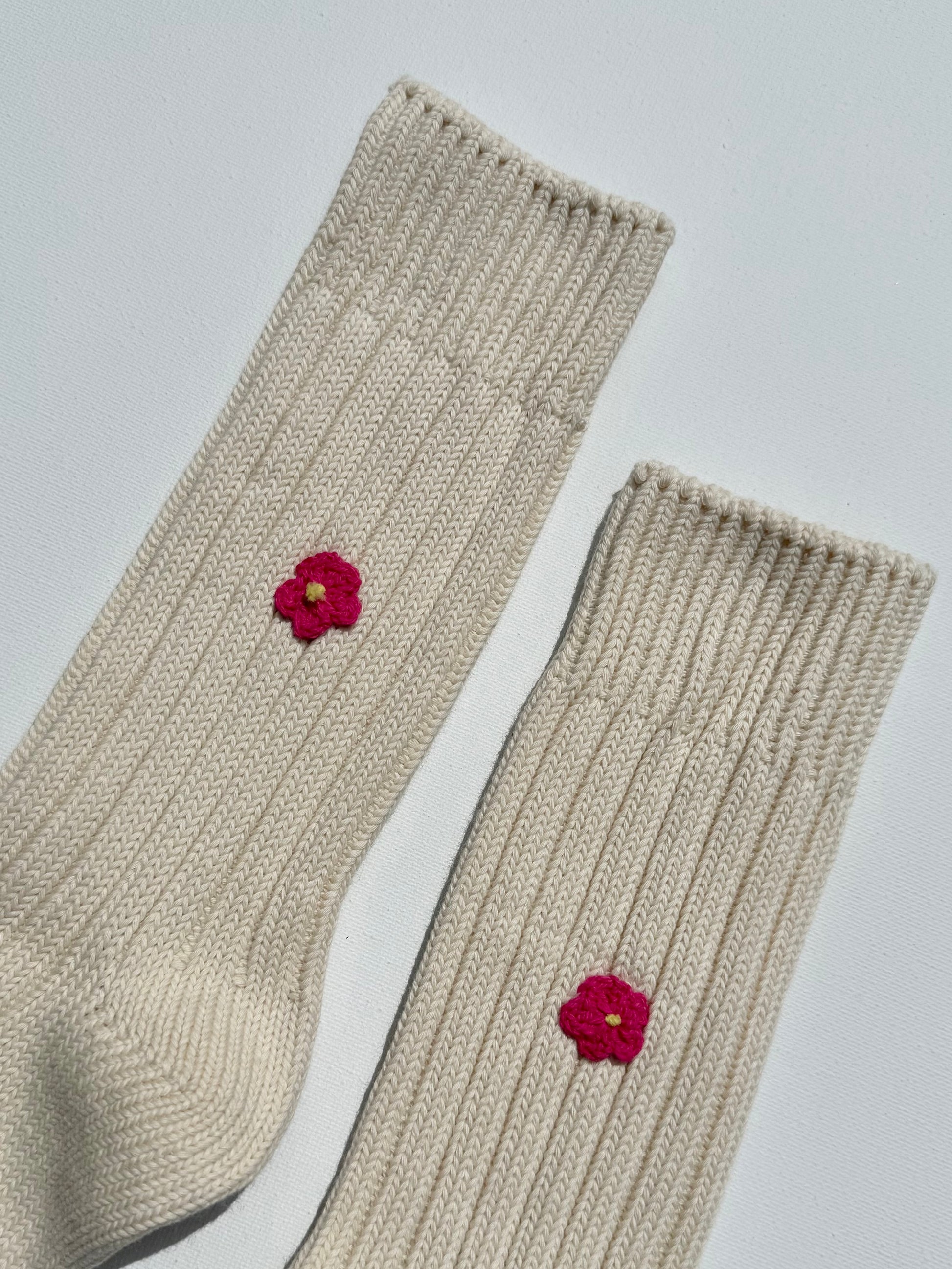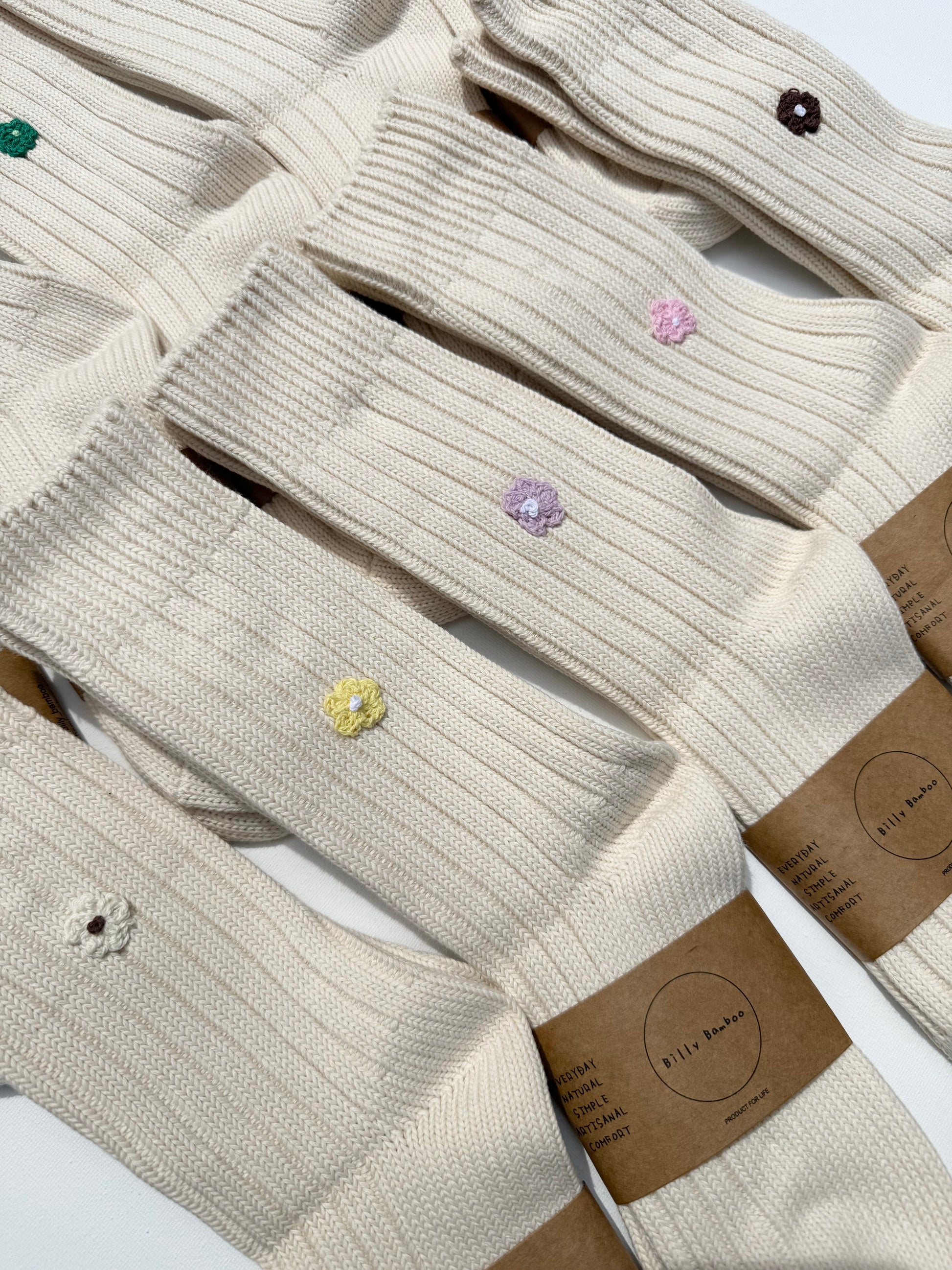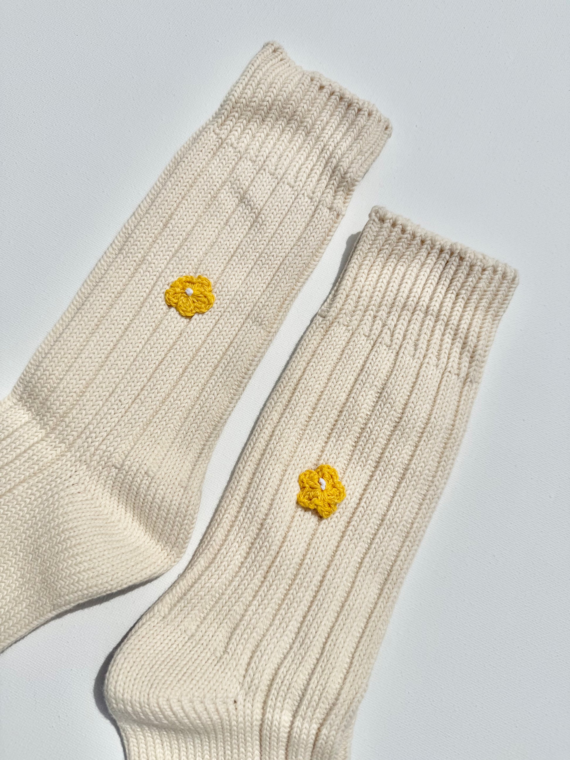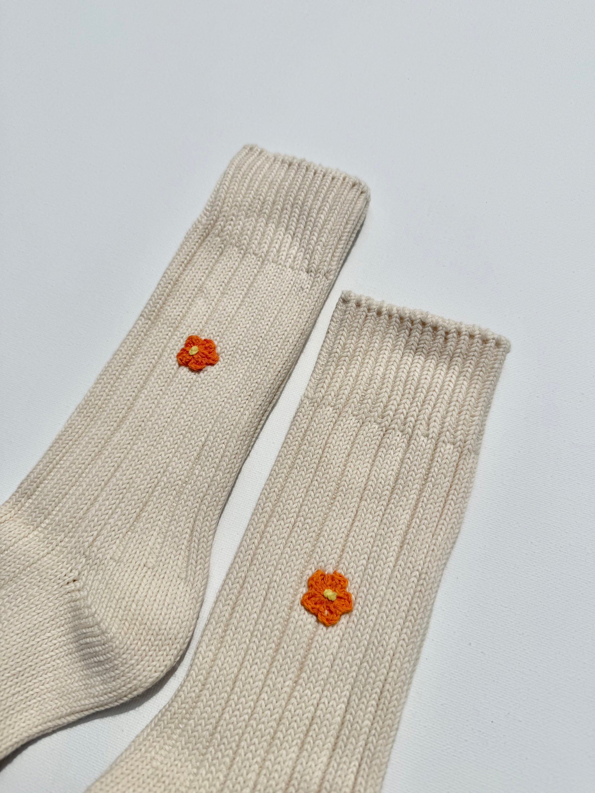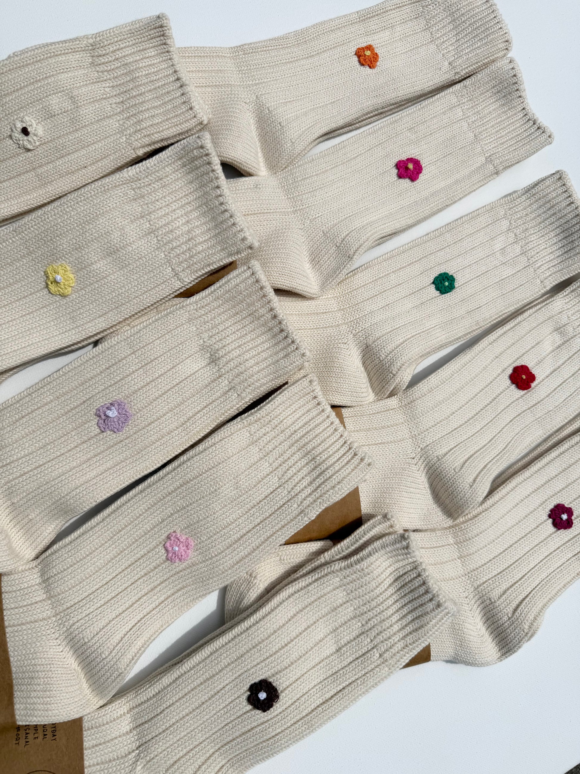 A modern classic with a handmade twist. Our Chunky Ribbed Cotton Socks are crafted from heavy-duty, undyed cotton for natural softness, durability, and all-season comfort. Each pair is finished with delicate crochet flowers, giving every step a touch of artistry and warmth.
