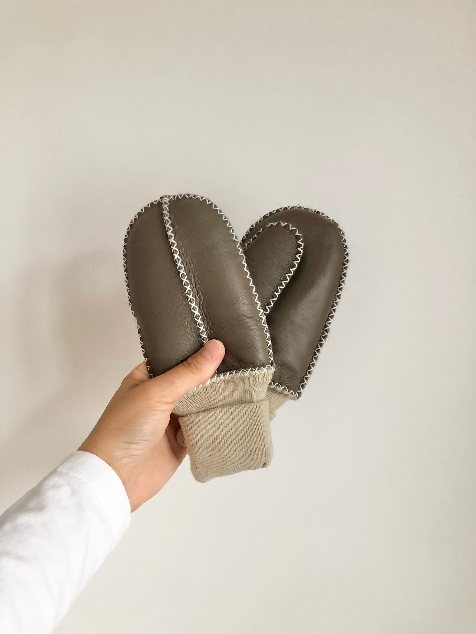 Real sheep skin, soft leather outside, cozy fur inside, hand stitched, a string attached both mittens together, easy for little kids to carry around.